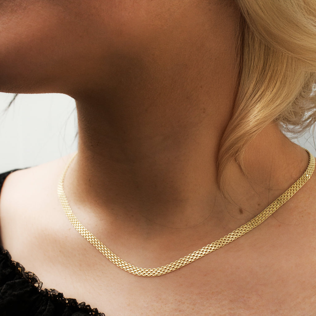 Gold necklace on a person with a blurred background