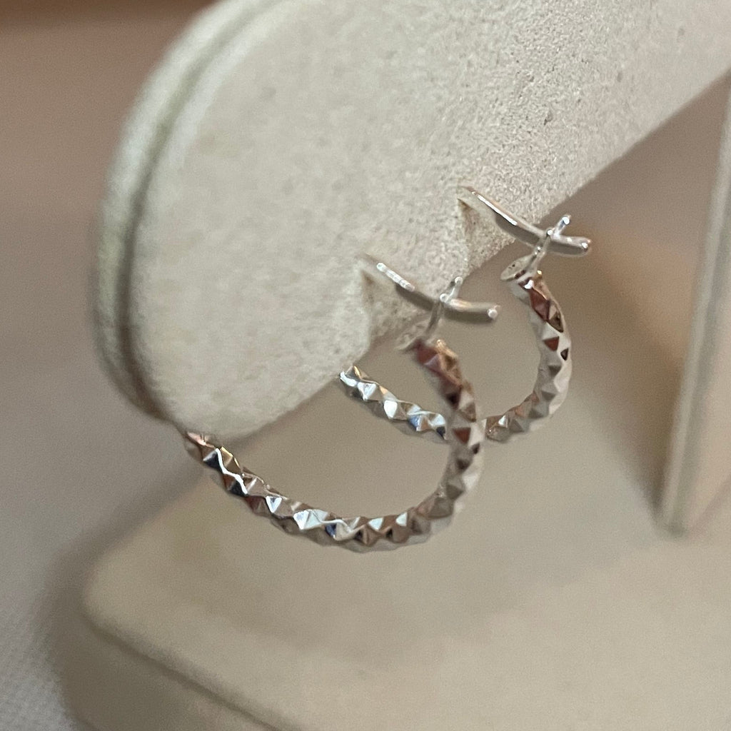 These sterling silver hoops are designed with textured diamond cuts all around making this piece contemporary yet timeless.